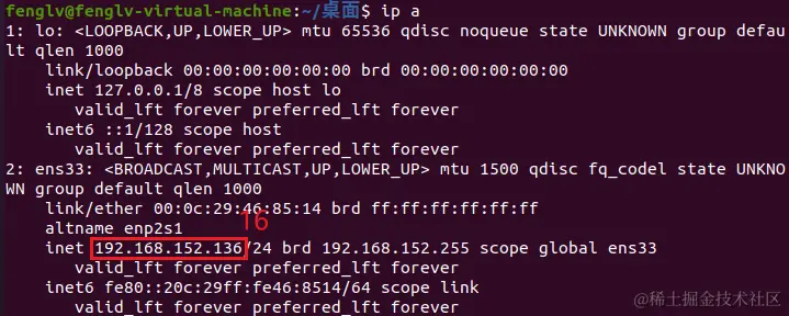 - 在1处打开的终端中执行命令 ip a 查看ubuntu的网卡名称,如14处所示,可以看出ubuntu的网卡名称是ens33,可能你的网卡是别的名字。