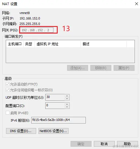 - gateway4配置为网关,保持和vmware的NAT设置处的网关地址一样,也就是13处让你记住的网关ip。
