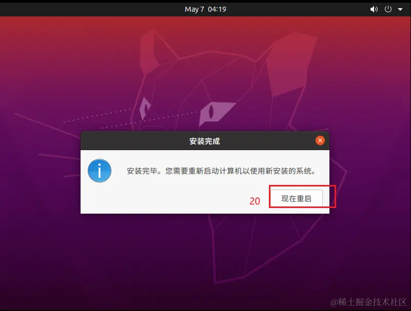 - 很快就会安装完毕,我这边大概不到3分钟,点击20处的现在重启,重启ubuntu系统。