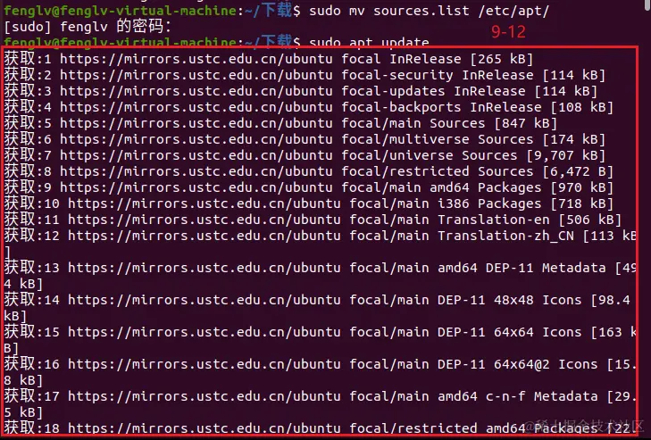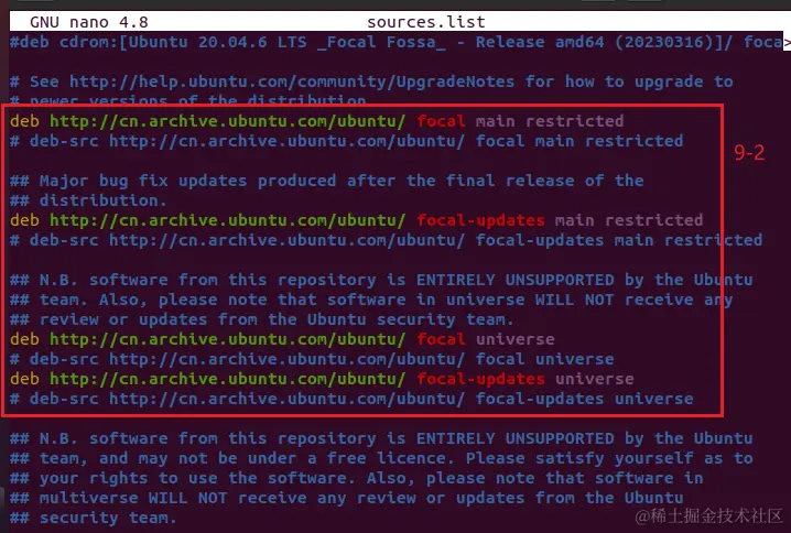 - 发现是镜像源的问题,需要把/etc/apt/sources.list文件里的镜像源地址改一下,如9-2处所示。