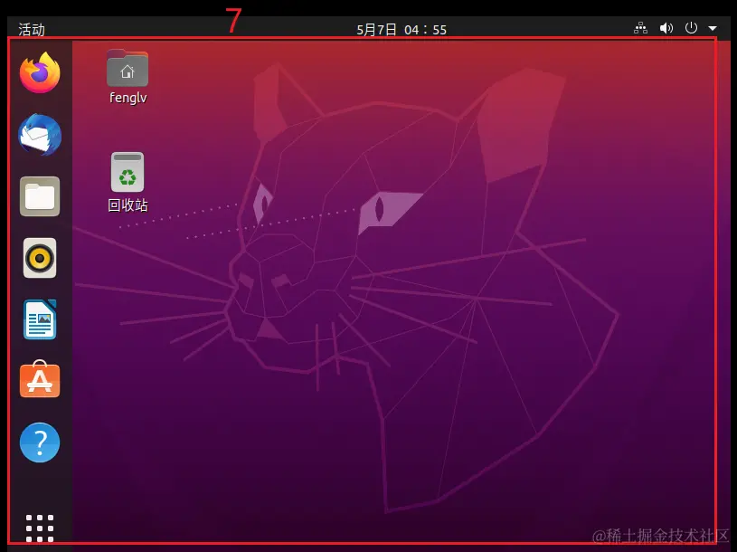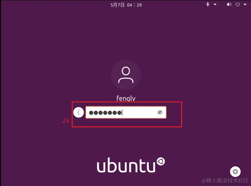 - 在23处输入密码,这个密码是在16处设置的,输入完成之后,按一下键盘上的Enter键,登录到ubuntu系统中。