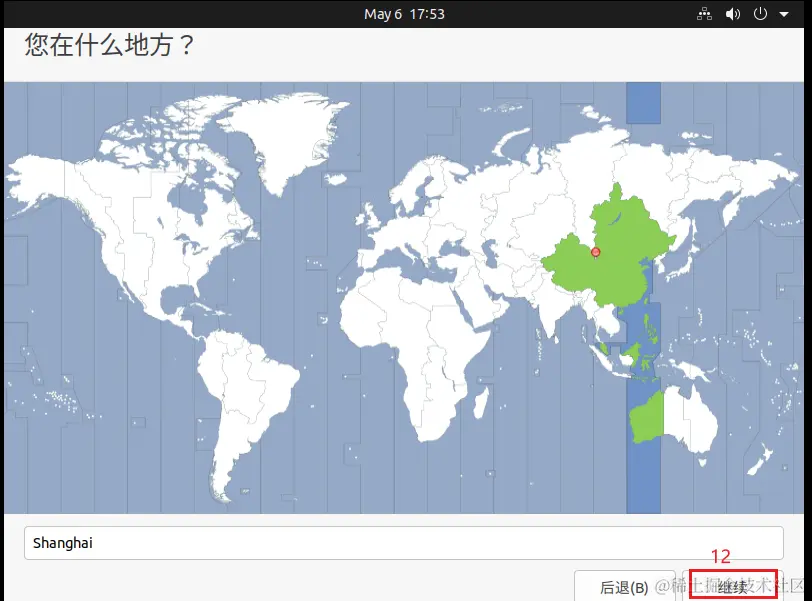 - 默认时钟是Shanghai,不需要修改,点击12处的继续。