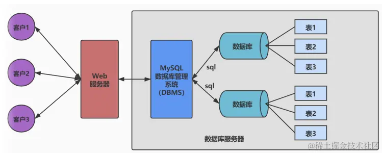 DBMS可以管理多个数据库,一般情况下我们会为不同的应用创建不同的数据库,每一个数据库中又可以包含多个表。DBMS和数据库之间通过SQL语言进行交互。