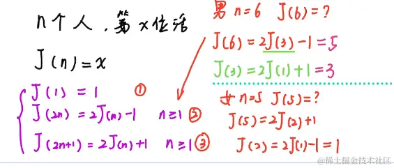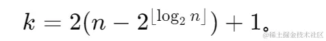 当 n 不是 2 的幂次时,巧妙的部分来了:考虑比 n 小的最大的 2 的 m 幂次,然后在第一个大循环中,留一张、丢一张,直到剩下 2 的 m 幂次张牌,此时我们就回到了问题的特殊情况:目前留下的第 1 张牌会留到最后。