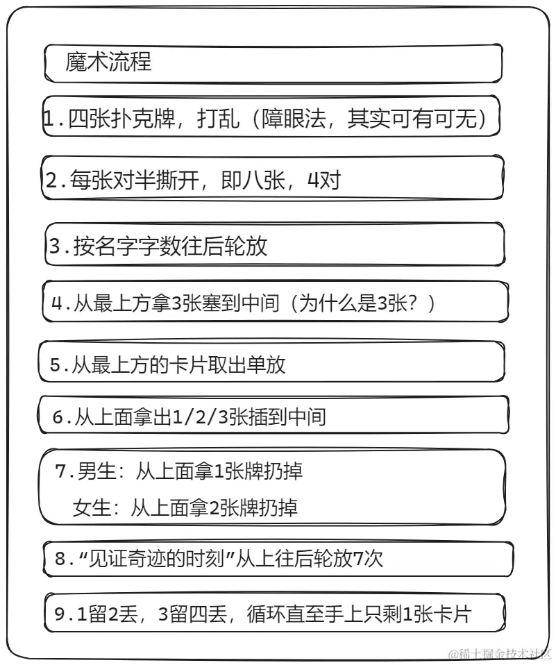 这个魔术,理解起来,确实有点"困难"。我们先看下整个魔术流程: