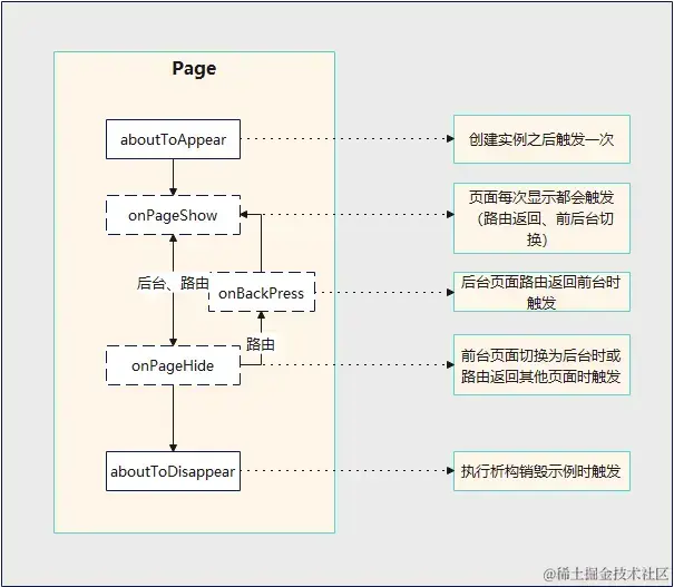 组件的生命周期包括aboutToAppear、onPageShow、onPageHide、onBackPress、aboutToDisappear五种状态,如图所示: