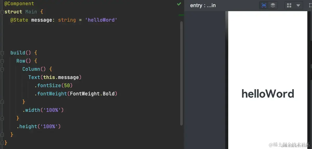鸿蒙应用也使用了声明式UI,作为大前端主流的开发方式,例如swiftUI、JetPack Compose、Flutter等。下面是一段鸿蒙的声明式UI代码: