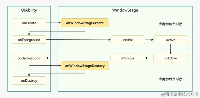 WindowStageCreate和WindowStageDestroy状态:UIAbility实例创建完成之后,在进入Foreground之前,系统会创建一个WindowStage。WindowStage创建完成后会进入onWindowStageCreate()回调,可以在该回调中设置UI界面加载、设置WindowStage的事件订阅。