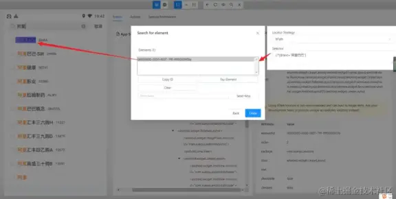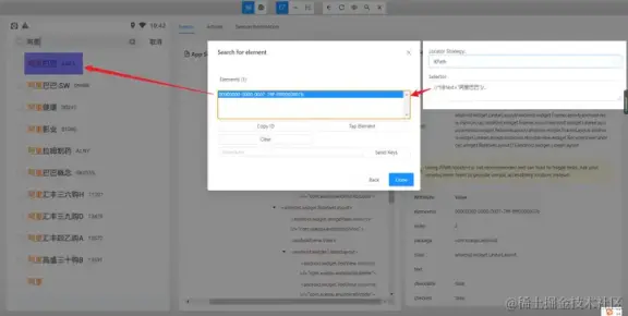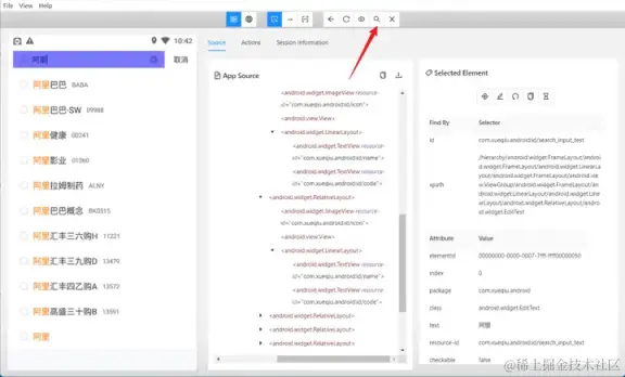 打开并连接元素定位工具,示例使用的工具 Appium Inspector,点击如下图所示的搜索图标。
