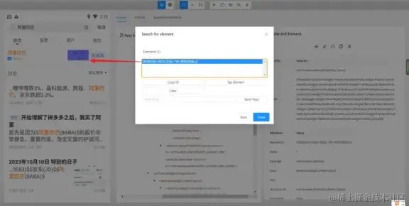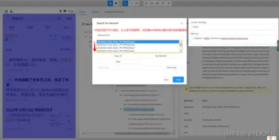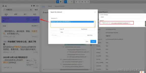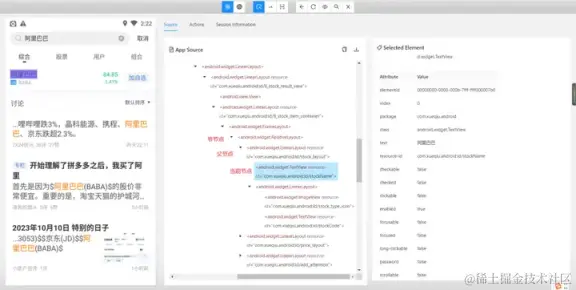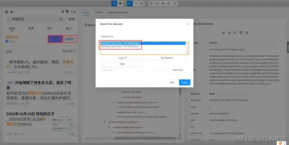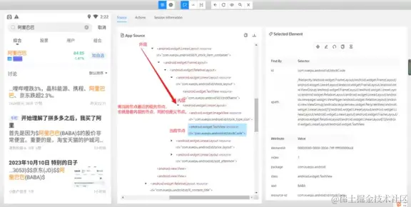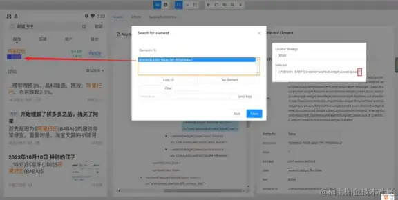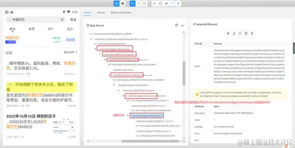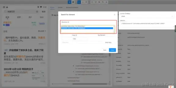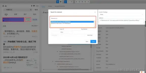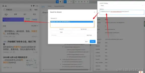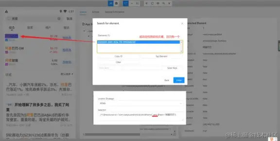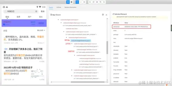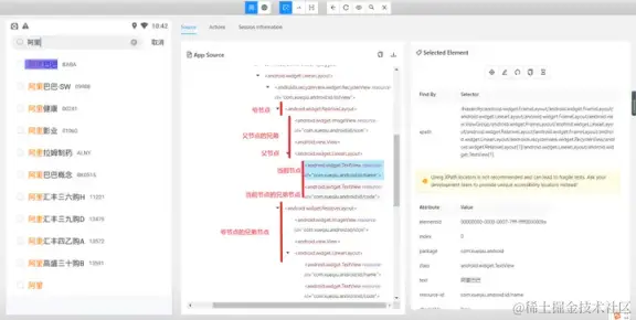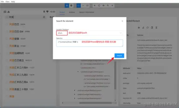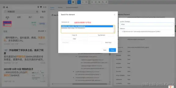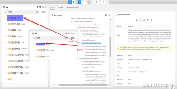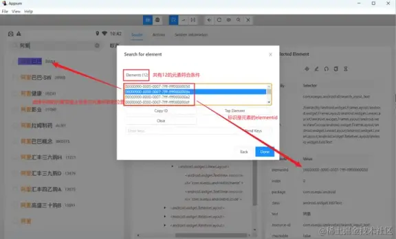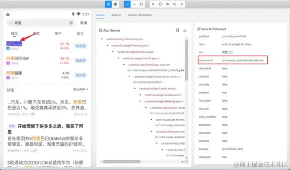 - 使用 and 运算符增加筛选条件进行过滤,需要满足符合 resource-id,且文本内容为阿里巴巴的元素。只有两个条件都符合时才会被选中