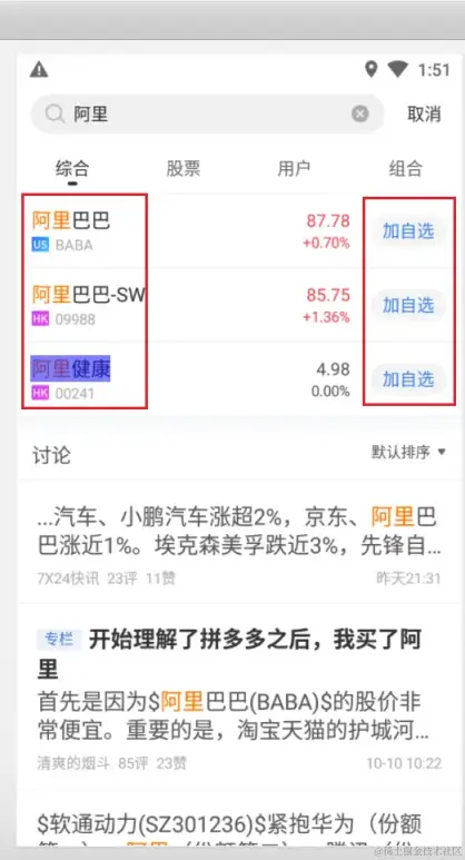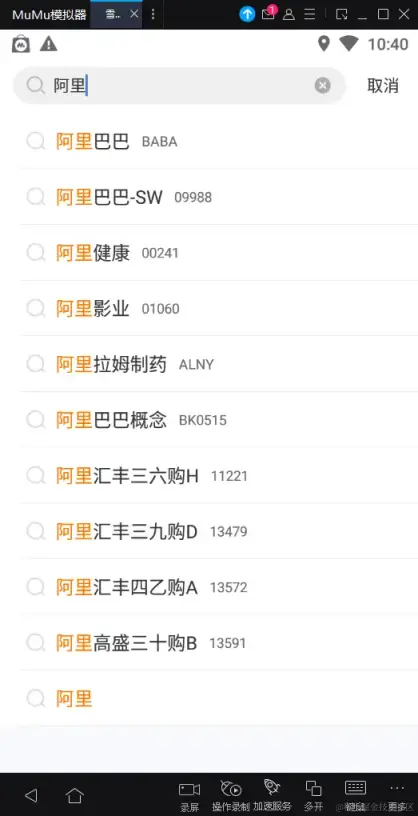 - 打开雪球 apk,在搜索框中输入阿里,界面如下: