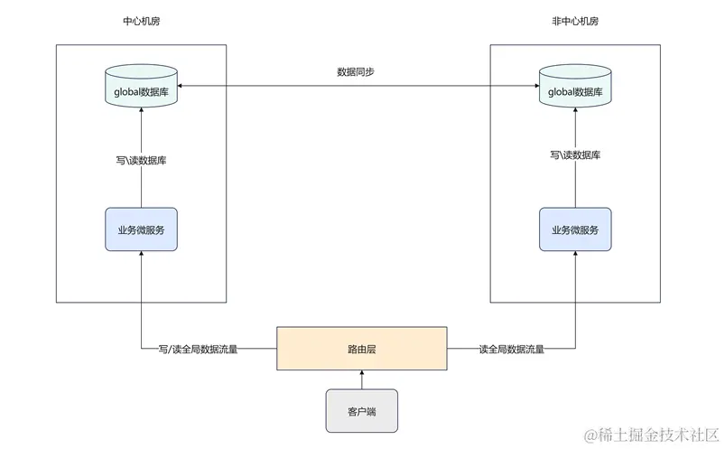 应用场景:异地多活架构下,某业务微服务用于修改商品库存等全局数据,同时全局数据保存在名为global的MySQL数据库中。对于该全局数据,写操作仅允许操作中心机房的global数据库,其他机房的global数据库只能读取数据。为了保证数据一致性,当修改全局数据时,该流量在路由层被路由至中心机房执行,其他读操作可路由至任意机房,如下图所示。