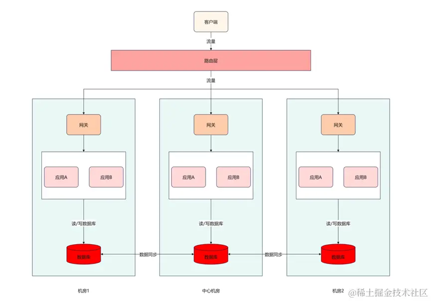 针对上图,机房1和机房2如果部署在两个城市,就变成了异地双活,为了更好的抵御风险,可以在多个地域部署机房,这样异地双活就升级为了异地多活。