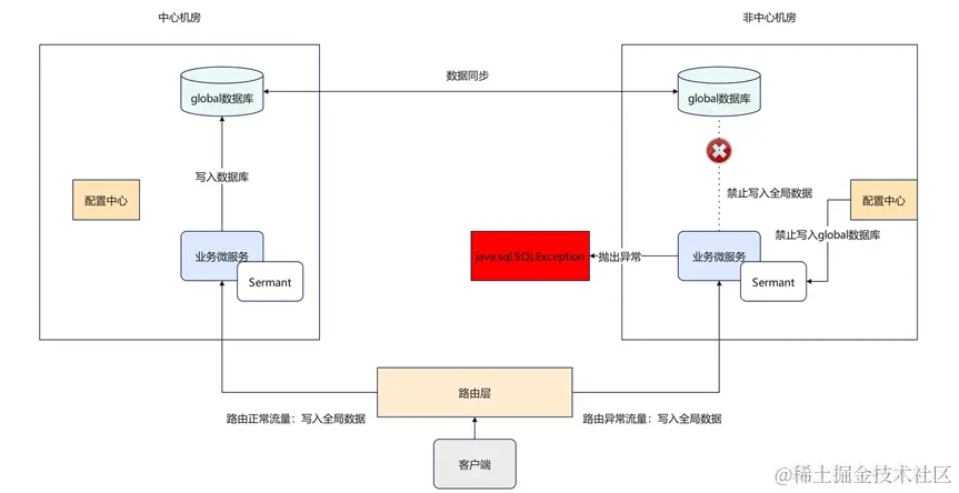 - 异地多活通过对流量分片处理,可以很好地解决数据一致性问题。但是对于全局数据,比如商品数量,在写入数据时,只允许操作中心机房的全局数据库。一般需要将操作全局数据的流量路由至中心机房,其他机房只允许读该数据库。当流量路由错误时,仍可能会写入非中心机房的数据库,导致数据冲突问题。此时需要对全局数据库添加防护,在非中心机房禁止写操作的执行。