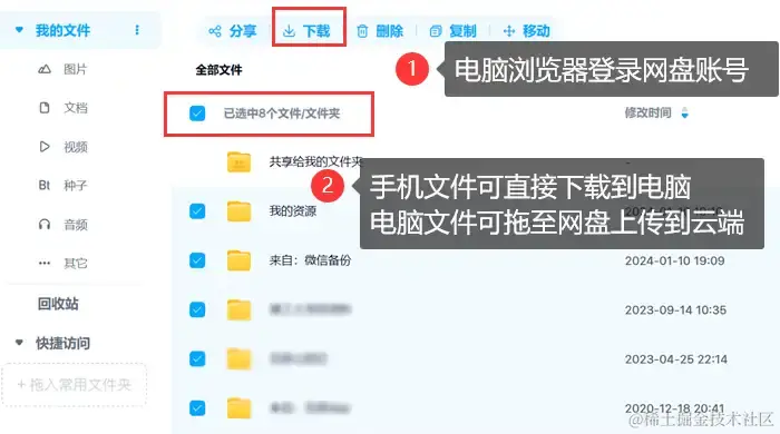 第一步:在电脑浏览器中搜索【百度网盘】,并登录,手机给电脑传文件,只需要选择网盘中的文件,然后点击下载;而电脑传输数据到手机,第一步是将文件拖至网盘,上传到云端,手机再在APP中自行下载即可。