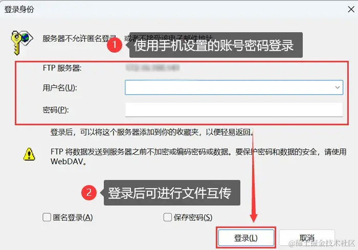 第二步:在弹出的聊天框中,输入在手机上设置的用户名和密码,点击登录,就可以控制手机中的各项数据,完成手机和电脑之间文件的传输。