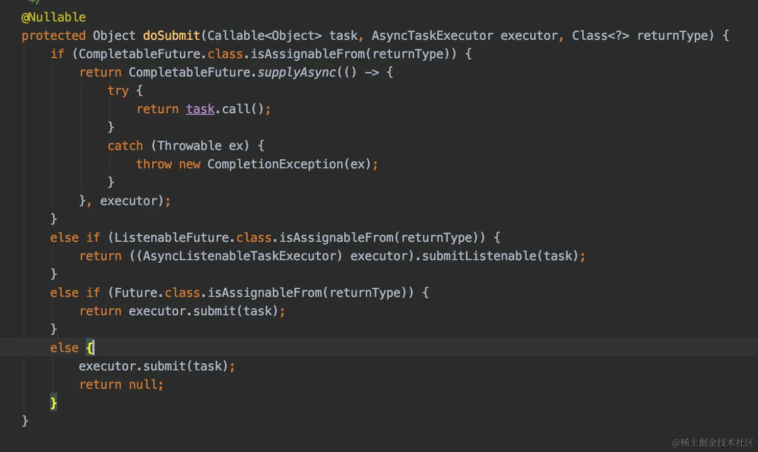 在AsyncExecutionInterceptor类的invoke()方法,会调用它的父类AsyncExecutionAspectSupport中的doSubmit方法,该方法时异步功能的核心代码,如下:
