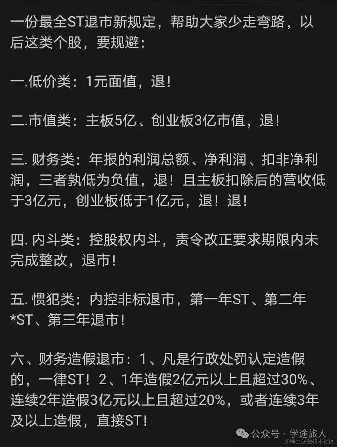 5月6日这5家ST被退市,在我看来是村里加强退市监管的一个标志。有人总结了新的ST的退市新规
