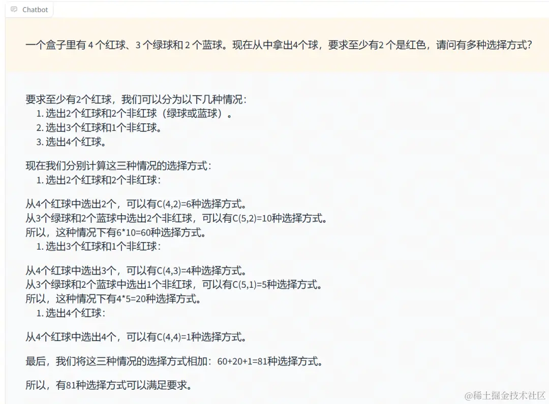 此外,在复杂的数学题解答方面,Eurux-8x22B也展现出了强大的能力,无论是排列组合、代数还是函数题,都能给出清晰的解题思路并准确地给出结果。例如给它一道高中排列组合题,Eurux-8x22B 首先给出了清晰的解题思路,然后一步步地拆解执行,再进行结果汇总,最后得到正确答案。