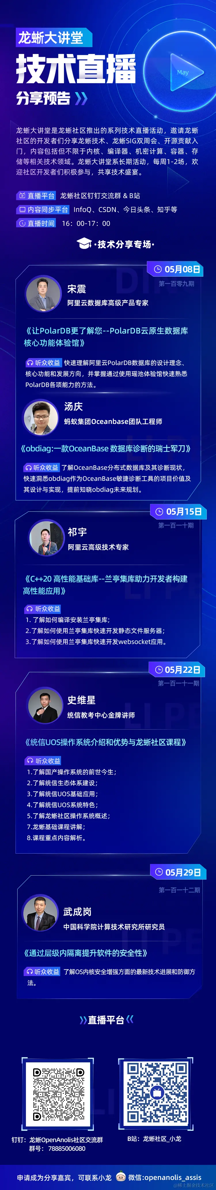 「龙蜥大讲堂」5 月精彩预告来了,点击下方海报抢先了解。本月又是满满的技术干货分享,多位大咖带你共享技术盛宴!欢迎扫描海报二维码提前进群,坐等精彩分享开始。