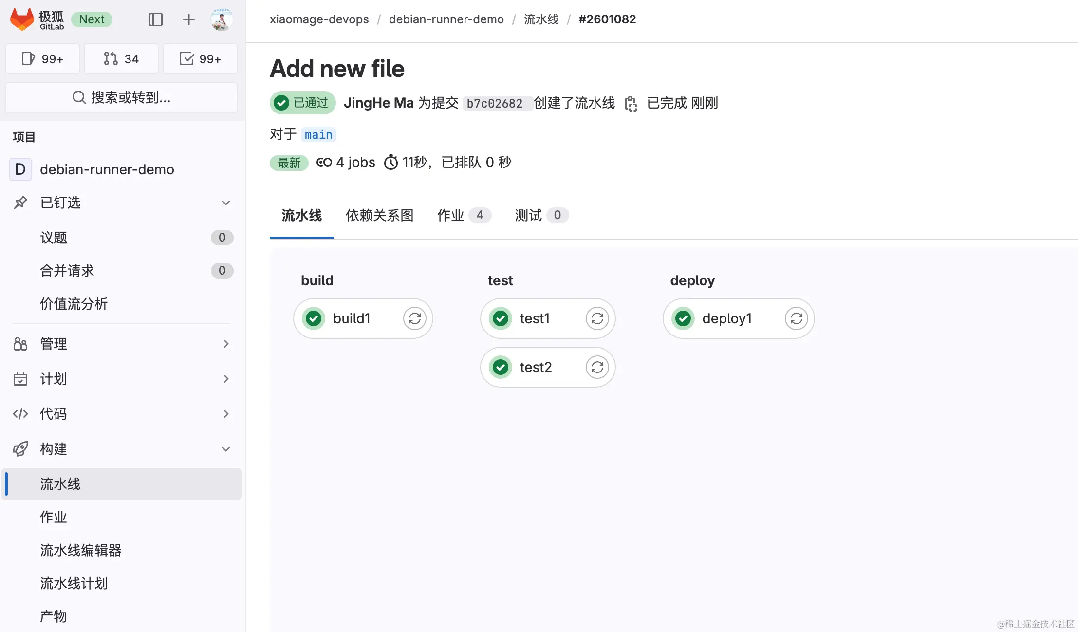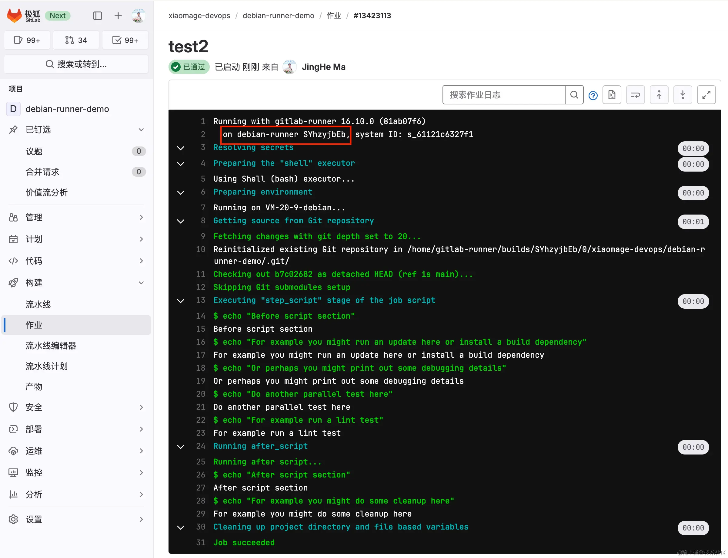 从日志可以看出作业就是刚才注册成功的 Runner 上执行的,因为注册时候给 Runner 取名为 debian-runner。