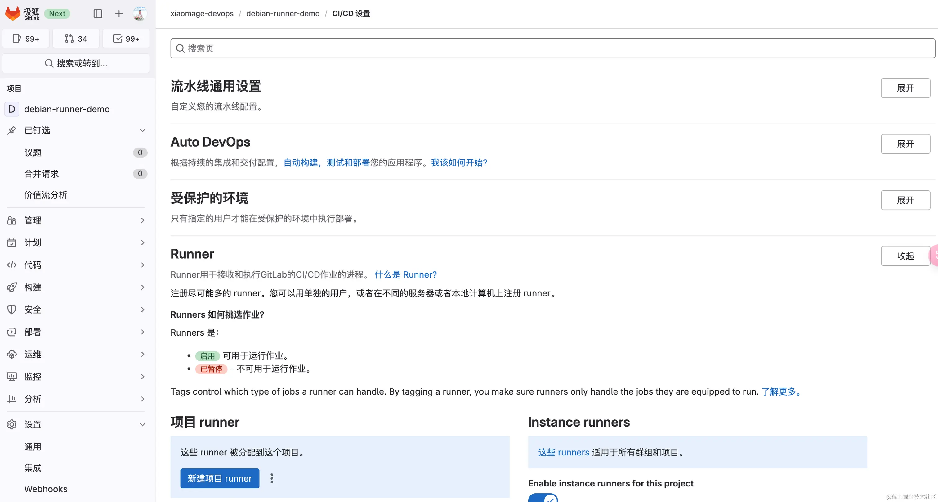 这时候就可以在项目 --> 设置 --> CI/CD --Runner 页面看到注册成功的 Runner 了: