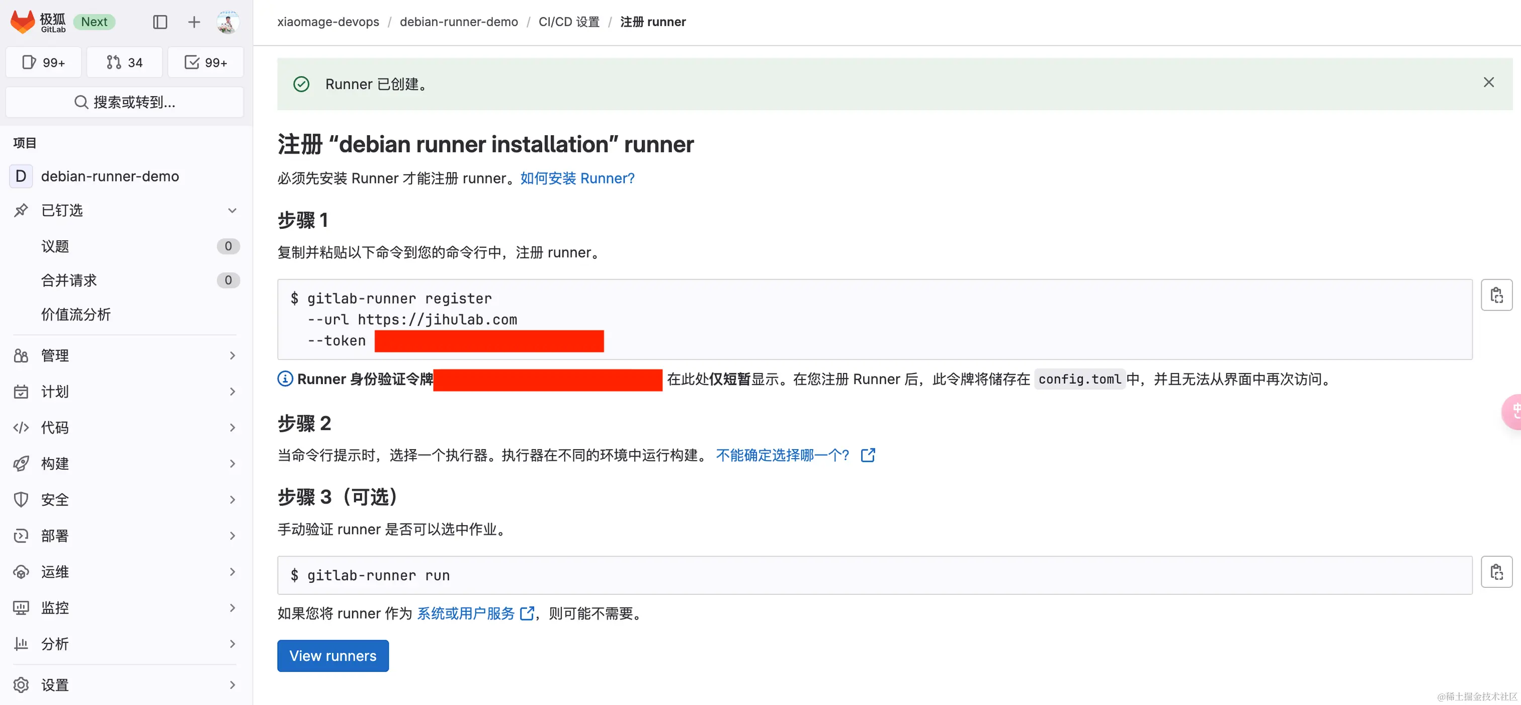 在出现的界面中会给出 Runner 注册的命令(同时也会包含 Runner 注册的 token,此 token 需要好好保存):
