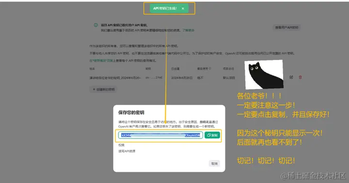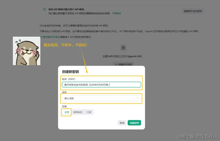 1、回到openai 界面后点击创建秘钥——填写项目昵称——选择项目类——全部权限——创建秘钥。