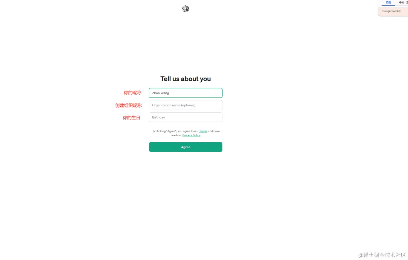 6、创建Open AI的基本账户信息,最好是英文,你写中文也行,就是后面会显示的很奇怪。