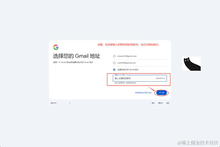 5、创建你自己的Gmail地址,也可以使用默认生成的Gmail地址。看个人喜好了。