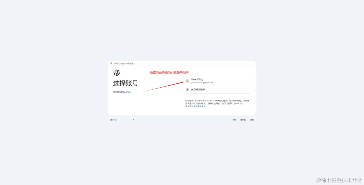 4、选择当前已登录的谷歌账号即可。没什么技术含量了~ 跟着步骤走就准没错。