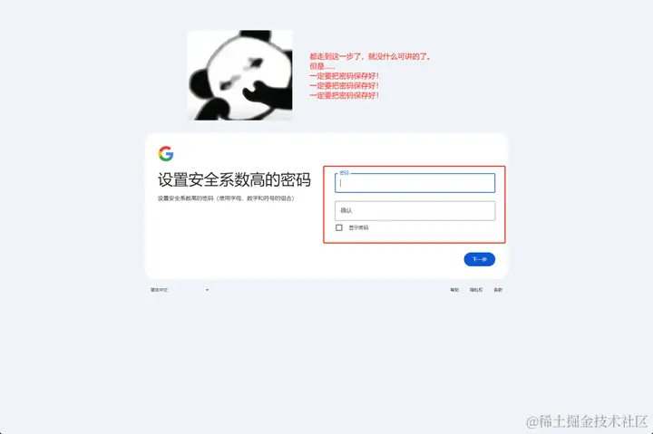 6、设置密码,这一步重要的不是设置密码,而是保存好密码。省的到时候记不得密码了。我一般会写在我的便签里,方便后面查找使用。