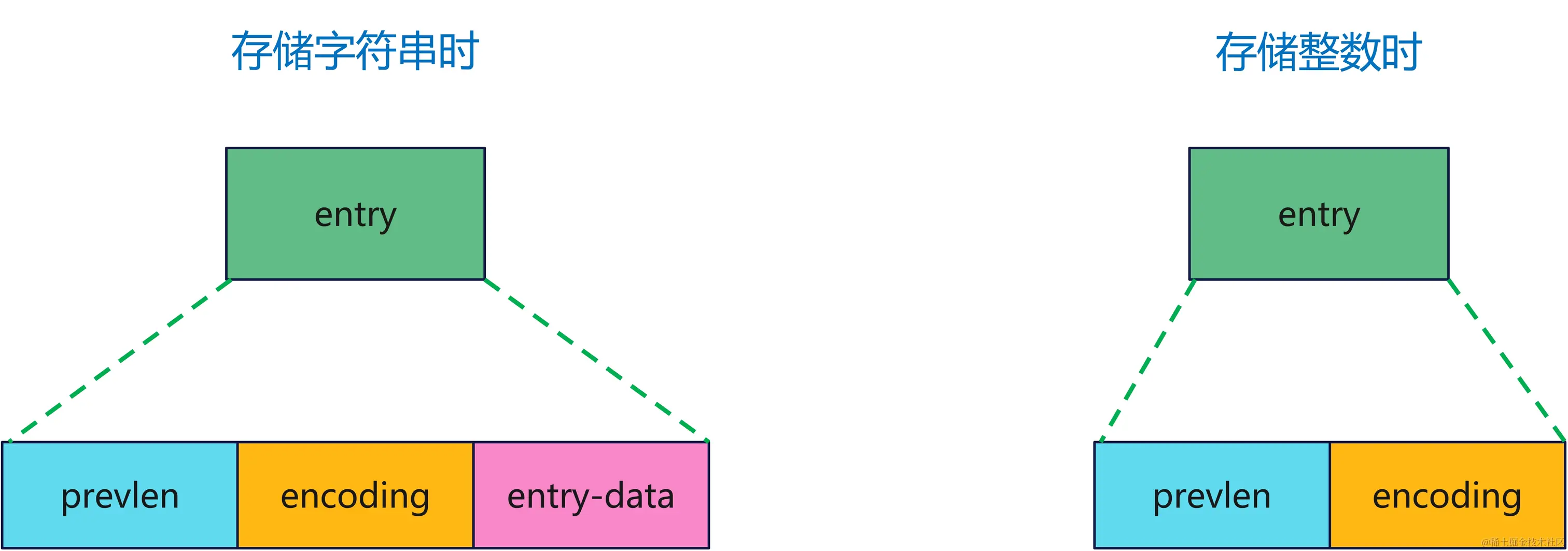 存储字符串时,有三个部分,而整数只有两个部分,主要是因为整数是以最紧凑的格式存储,没有使用任何额外的标记或填充字节,所以在 zipList 中,整数值的编码同时包含了类型信息和实际的整数值。