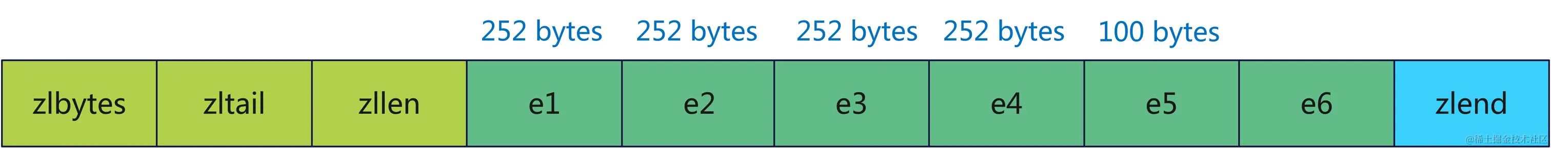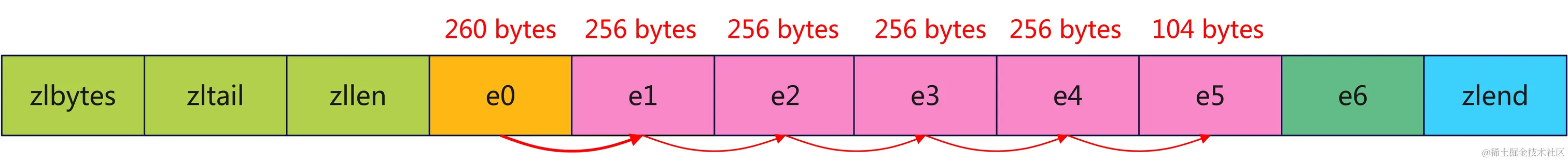 e2 的存储空间增加会导致 e3 的增加,e3 又会导致 e4,e4 又会延伸到 e5,但是 e5 的存储空间由 100bytes 增加到 104 bytes,小于 254 bytes,所以不会导致 e6 的 prevlen 值增大,至此 “连锁更新” 结束: