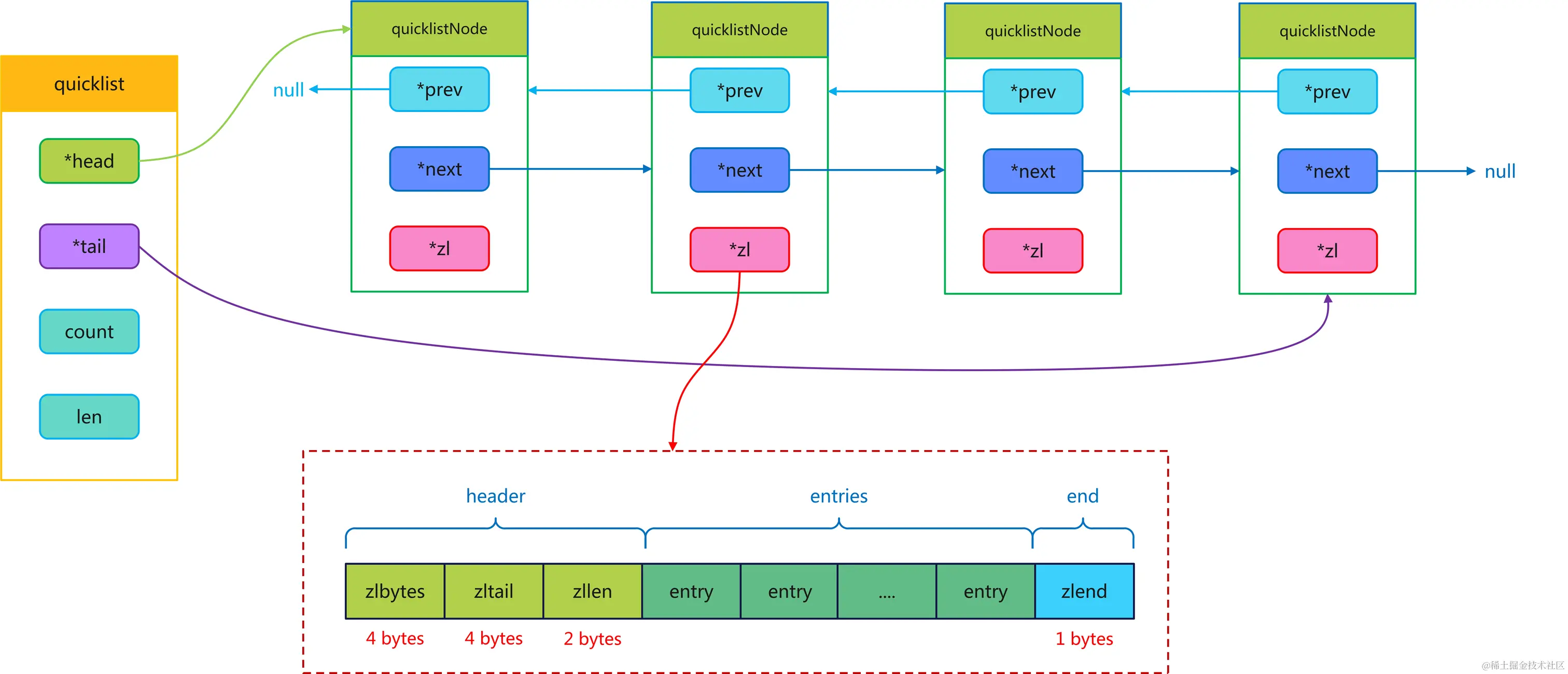zlbytes:4 个字节,记录整个ziplist占用的总字节数。zltail:4 个字节,记录到ziplist最后一个元素的偏移量,这样就可以快速定位到最后一个元素,提高从列表尾部添加或者访问元素的效率。zllen:2 个字节,记录ziplist中元素的个数。