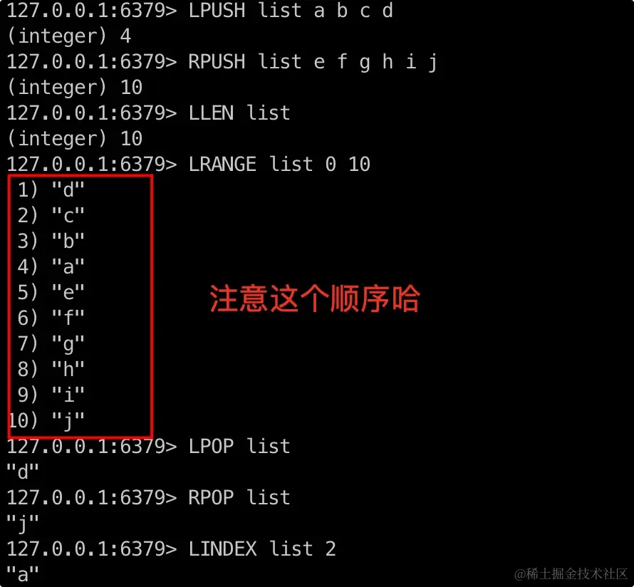 LINDEX key index:获取列表在 index 位置的元素。index 是基于 0 的,也可以是负数,-1 表示最后一个元素,-2 表示倒数第二个元素等。 -