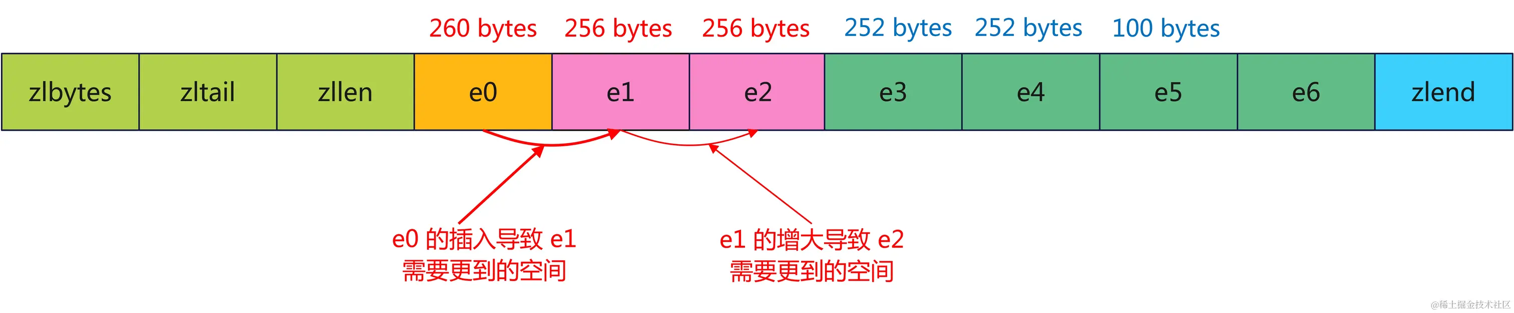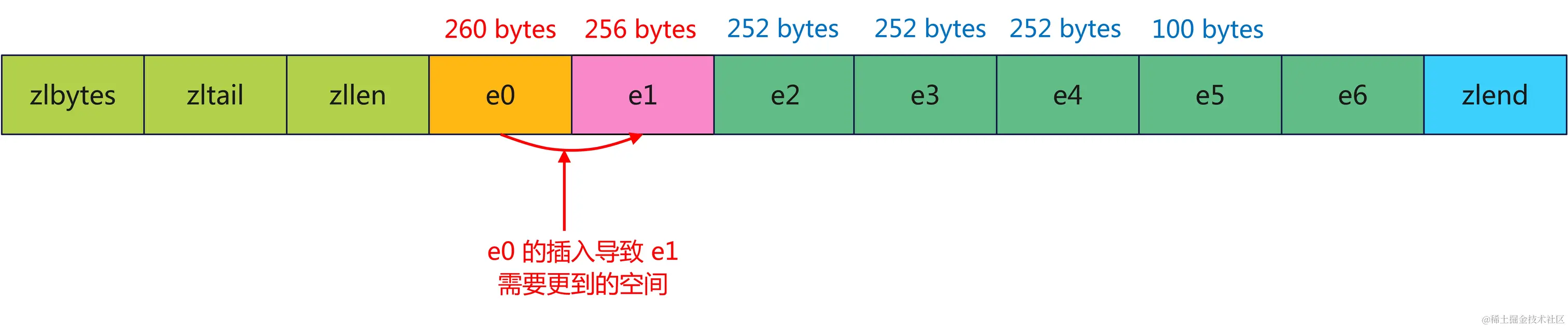 e1 由 252 bytes 增加到 256 bytes,那么 e2 的 prevlen 就会由 1 bytes 增加到 5 bytes,从而导致 e2 的存储空间由 252 bytes 增加到 256 bytes:
