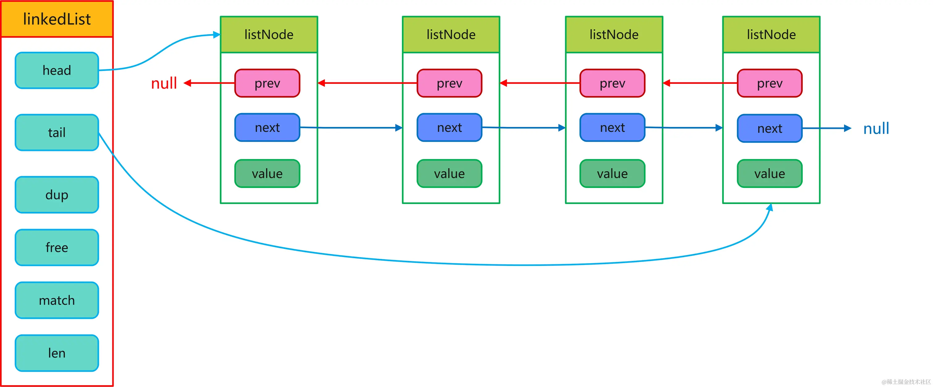 linkedList 是一个由一个个节点组成的双向链表,数据结构定义如下: