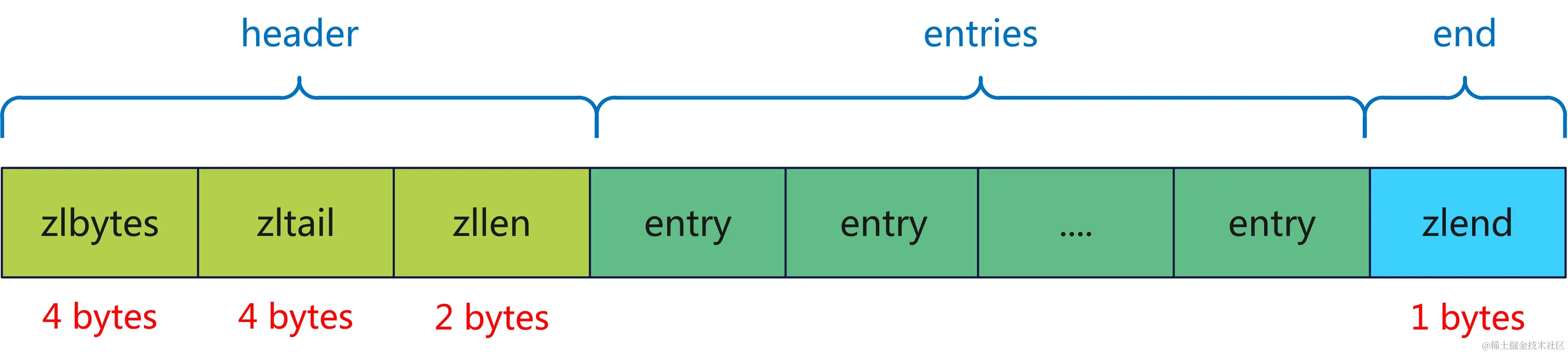 zipList 的内部结构主要分为三个部分:表头(header)、条目(entries)和表尾(end),如下图:
