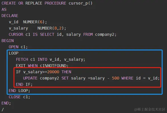 **“v_salary>=20000”,**在这个例子中,当v_salary >= 20000 时,则执行THEN 后面的 UPDATE语句。