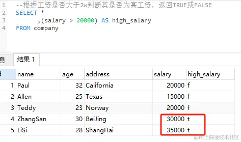 上述SQL示例中,我们从company表中选择name、age、address、salary和一个布尔表达式(salary > 20000),该表达式用于判断员工的工资是否高收入。 结果集中的high_salary列将显示布尔值TRUE或FALSE。