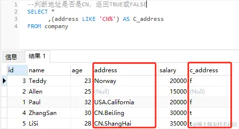 上述SQL示例中,我们从company表中选择name、age、address、salary和一个布尔表达式(address LIKE 'CN%'),该表达式用于判断员工的地址是否在CN。 结果集中的c_address列将显示布尔值TRUE或FALSE。