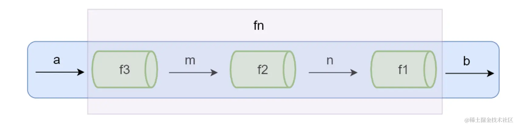下面这张图中可以想象成把 fn 这个管道拆分成了3个管道 f1, f2, f3,数据 a 通过管道 f3 得到结果 m,m 再通过管道 f2 得到结果 n,n 通过管道 f1 得到最终结果 b