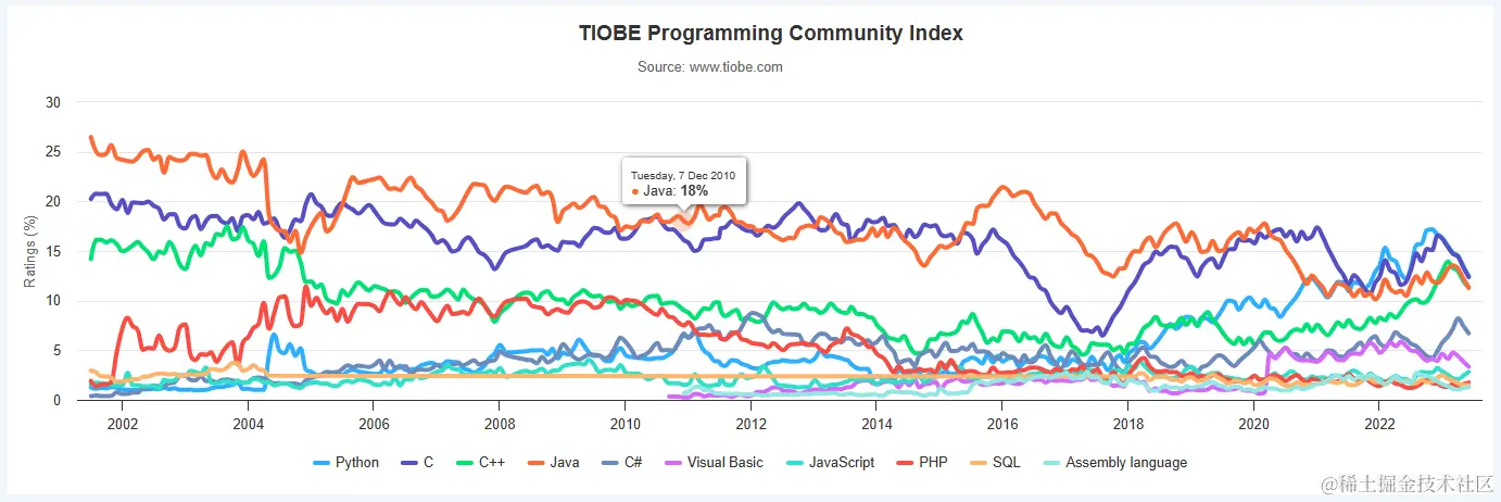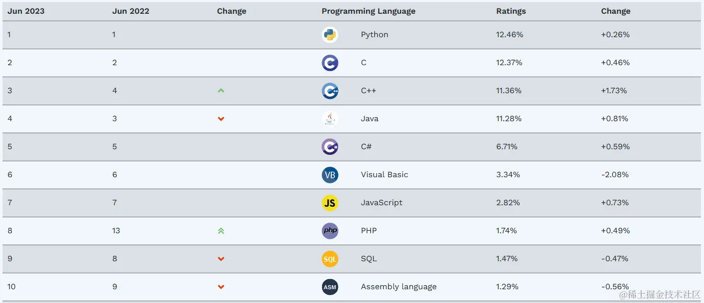 从下面两张图可以看到,Python使用率从2014年的谷底快速反弹,到2023年时,已经霸榜第一名的位置,使用率为12.46%。