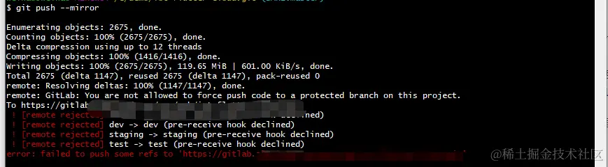 需要打开GitLab,在项目设置那里,开启允许强制更新开关,然后再运行命令git push --mirror即可。