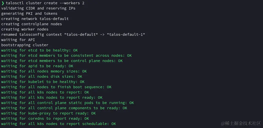 使用 docker 和 talosctl 安装一个三节点集群。以下命令将创建一个 3 节点集群(controlplane、workernode-1、workernode-2)。