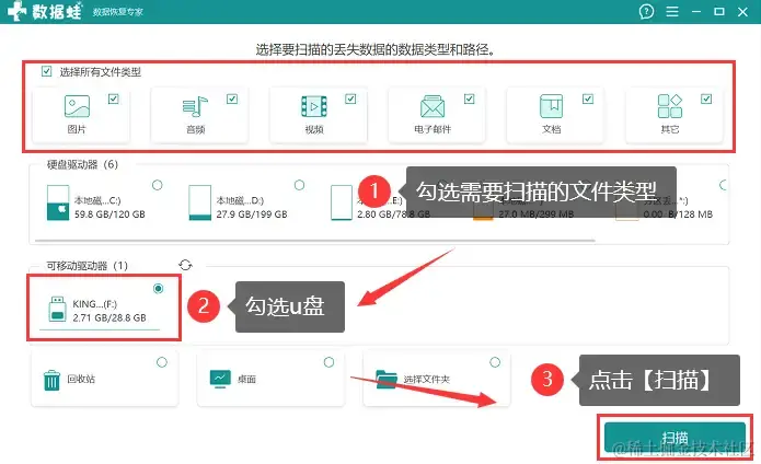 通过上述的方法,我们有机会打开u盘文件。如果我们的u盘文件丢失了怎么办呢?可以尝试使用数据蛙恢复专家来为我们找回丢失的数据。这是一款简单实用的数据恢复工具,操作步骤比较简单,并且还支持免费试用。当我们的数据丢失后,该方法有机会为我们找回丢失的电脑数据,有需要的用户可以下载软件后按以下步骤操作。