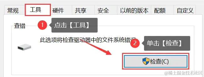 4)点击【检查】,选择【扫描并修复驱动器】进行文件系统检查和修复。