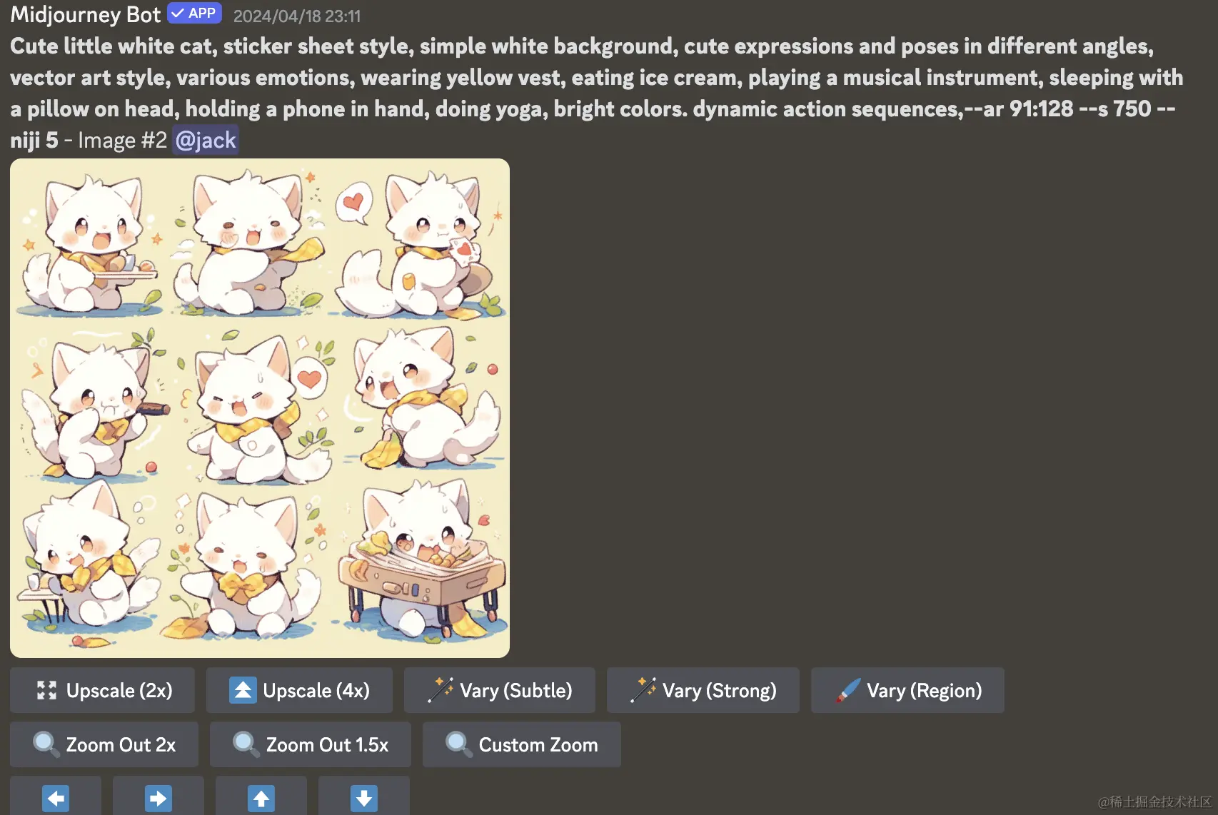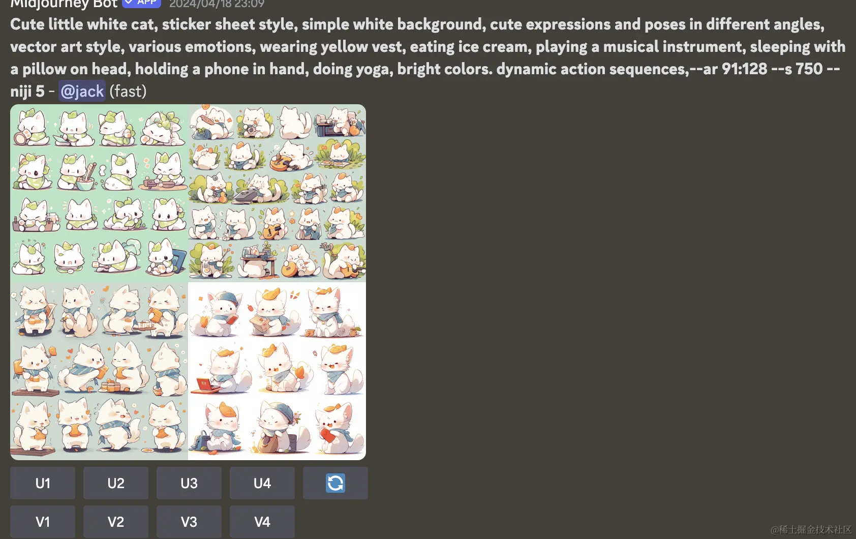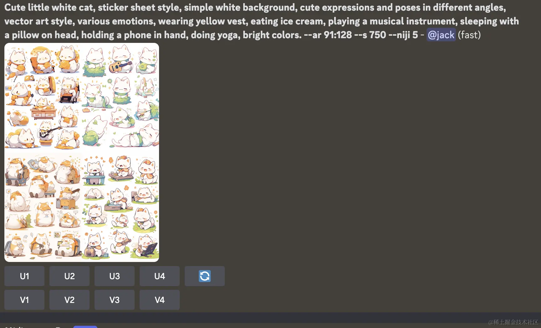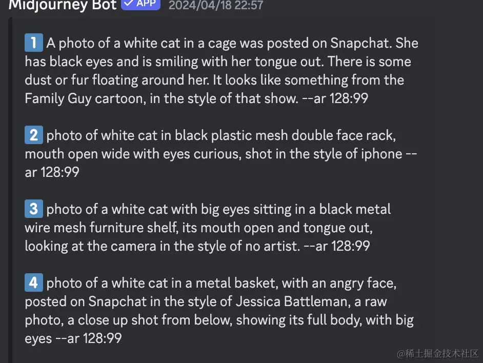 打开MJ ,使用参数"/describe" 并上传刚刚保存的图片,从而解析出了四组对应提示词