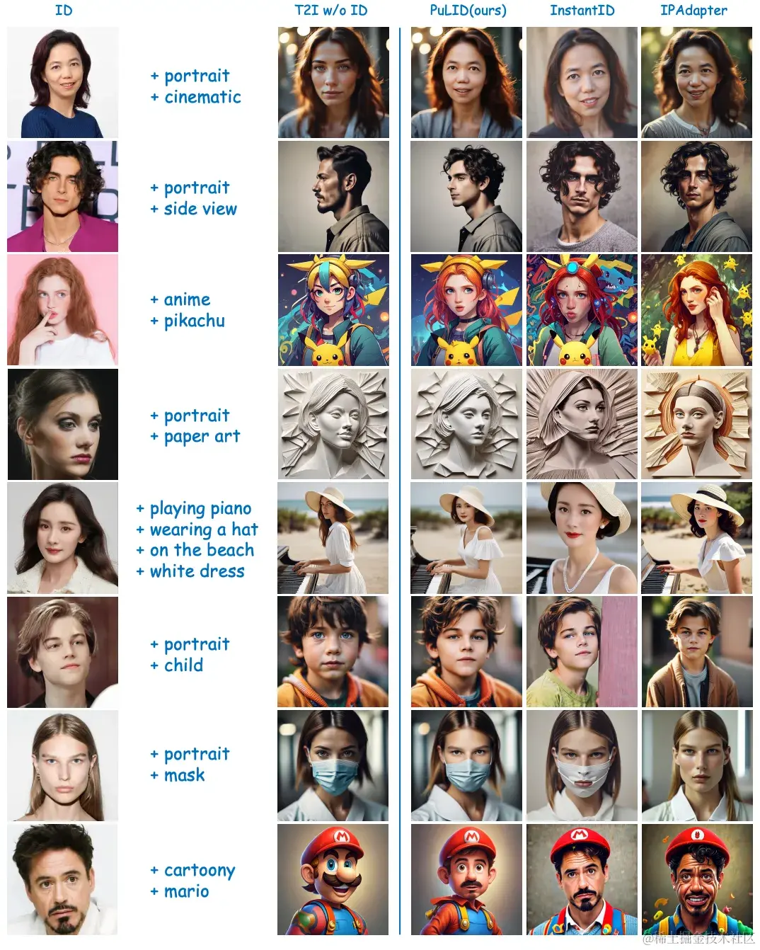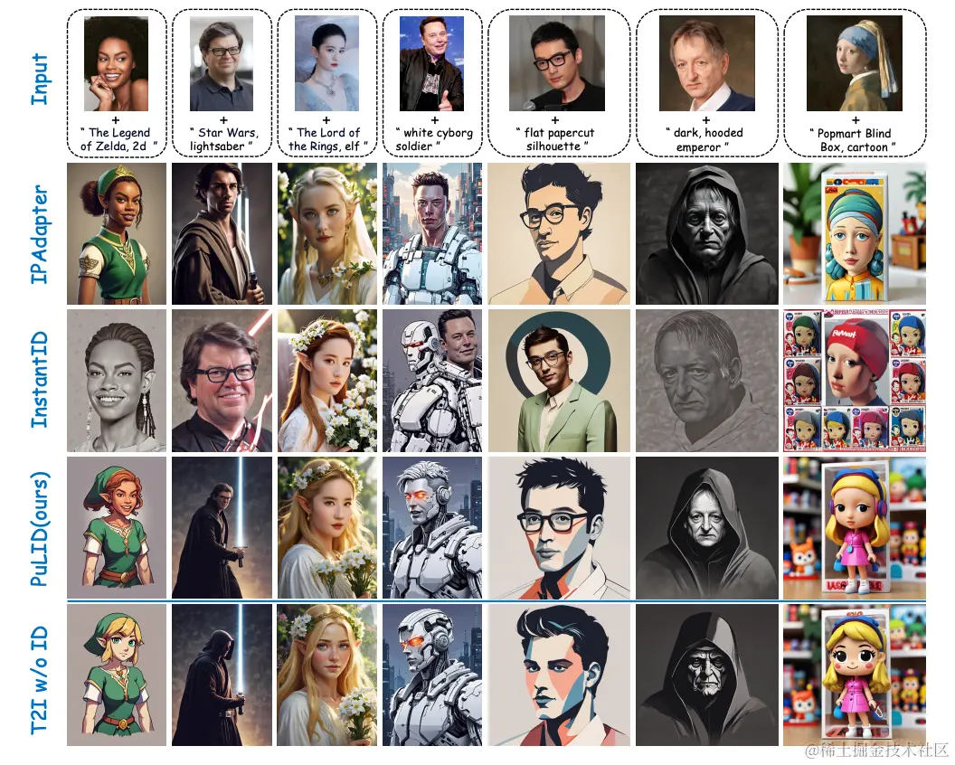PuLID是通过将轻量级的Lightning T2I分支和标准的扩散分支结合,并引入对比对齐损失和精确的身份ID损失来实现的。大量实验表明,PuLID在身份ID保真度和可编辑性方面都取得了优异的性能。另一个独特的特点是,PuLID在插入身份ID前后,能够尽可能保持图像元素(背景、光照、构图和风格等)的一致性。